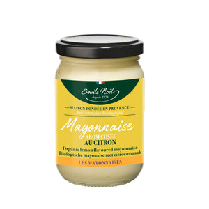 Maionese biológica aromatizada a limão, 185g. Ingredientes: Óleo de girassol (76,9%)*, água, gema de OVO* (7,1%), MOSTARDA* dijon (2,7%) (água, sementes MOSTARDA*, vinagre*, sal), sal, óleo essencial de limão* (0,1%), espessantes (goma xantana e farinha de guar). *De produção biológica. FR-BIO-01. Agricultura UE/ não UE.