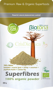 Este produto contém como ingrediente principal da Biotone Superfibres uma fibra alimentar totalmente natural, derivada de goma arábica 100% pura da árvore do senegal Acacia que contém pelo menos 90% de fibras solúveis na forma de arabinogalactanos (polissacarídeos). Biotona Superfibres também contém fibras insolúveis da farinha de coco, folhas de pera espinhosa e sementes de cânhamo. A polpa seca do baobá africano também contém muitas fibras alimentares solúveis e insolúveis, além de vitaminas, minerais e outros fitonutrientes. O pó de psyllium ou banana amarela das Índias (com mais de 80% de composição fibrosa) é capaz de absorver até 50 vezes o seu peso