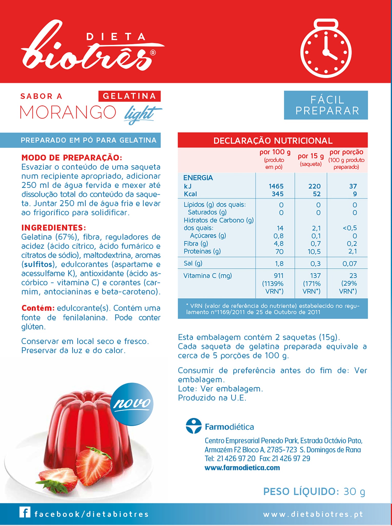 As Gelatinas Light DIETA BIOTRES contêm proteínas que contribuem para a manutenção e crescimento da massa muscular, podendo ser utilizados no âmbito de um programa de perda de peso, de preferência acompanhado por uma dietista ou nutricionista.