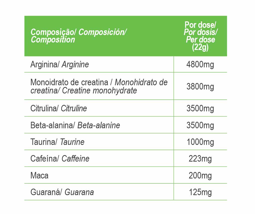 - L-arginina, monoidrato de creatina, adicificante (ácido cítrico), L-citrulina, beta-alanina, taurina, aroma, Coffeine® (cafeina anidra natural proveniente de grãos de café), corante (E141), Lepidium meyenni W. (raiz), extrato de guaraná (Paullinia Cupana K., semente, 12% cafeína), edulcorante (sucralose). Pode conter vestígios de glúten, leite, ovo, soja e tremoço.