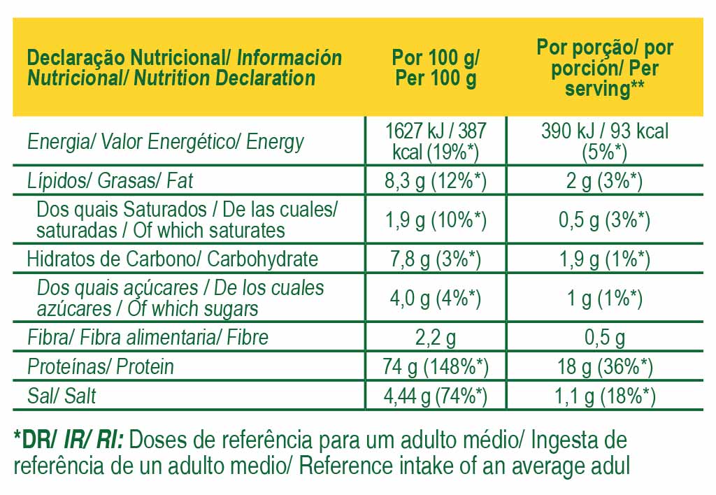 Proteína de ervilha (95%), proteína de arroz integral (3%), aroma, corante (betacaroteno), Spectra™ (Coffea Arabica, concentrado de rebentos de brócolos, extrato de chá verde, extrato de cebola, extrato de maçã, extrato de acerola, Camu Camu, quercetina, concentrado de tomate, concentrado de brócolos, concentrado de açaí, concentrado de curcuma, concentrado de alho, concentrado de manjericão, concentrado de orégãos, concentrado de canela, concentrado de baga de sabugueiro, concentrado de cenoura, concentrado de mangostão, concentrado de groselha, extrato de mirtilo, concentrado de cereja, concentrado de amora preta, concentrado de arónia, concentrado de framboesa, concentrado de espinafre, concentrado de couve, extrato de arando, concentrado de couve de bruxelas), edulcorante (glicosídeos de esteviol), cloreto de sódio.