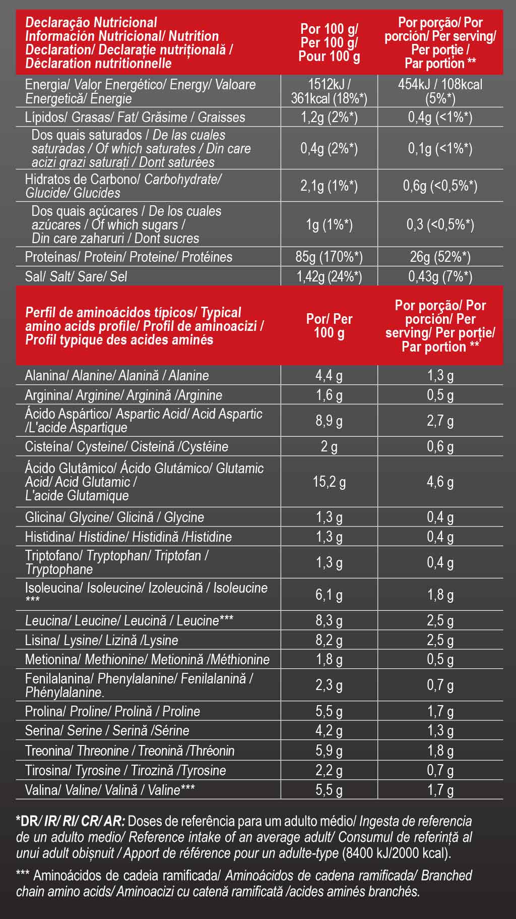 - OPTIPEP 90® (Hidrolisados de isolados de proteína do soro do leite) [90%], ISOLAC® (Isolados de proteína do soro do leite) [5%], aromas, corante (vermelho de beterraba), espessantes (goma guar, goma xantana), sal, edulcorantes (sucralose, glicosídeos de esteviol provenientes de estévia). Pode conter vestígios de glúten, soja, ovo, aipo, amendoim, frutos de casca rija, crustáceos, peixe, mostarda e sulfitos.