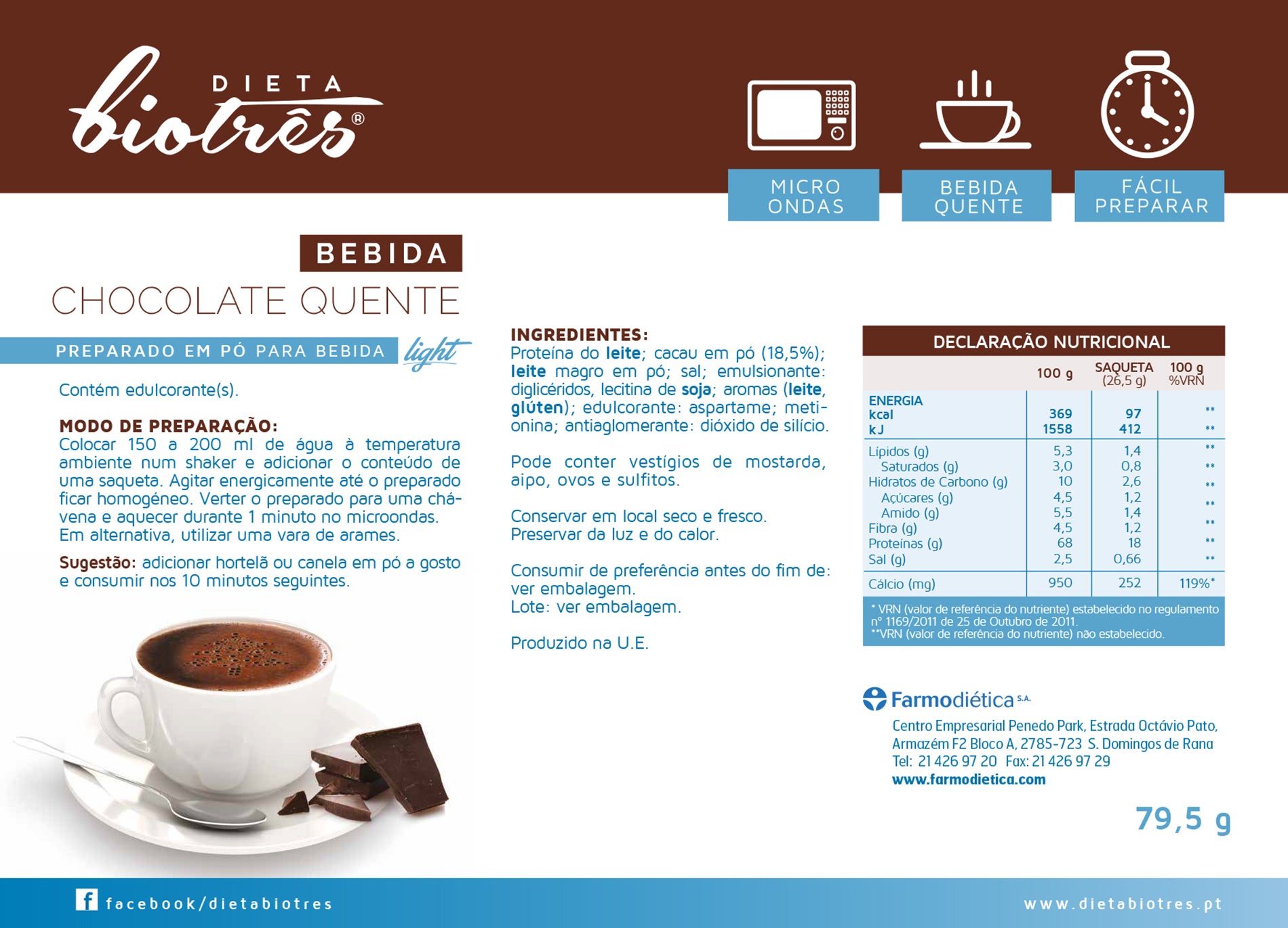 Bebida Light Chocolate Quente 3*26gr - Dieta Biotrês