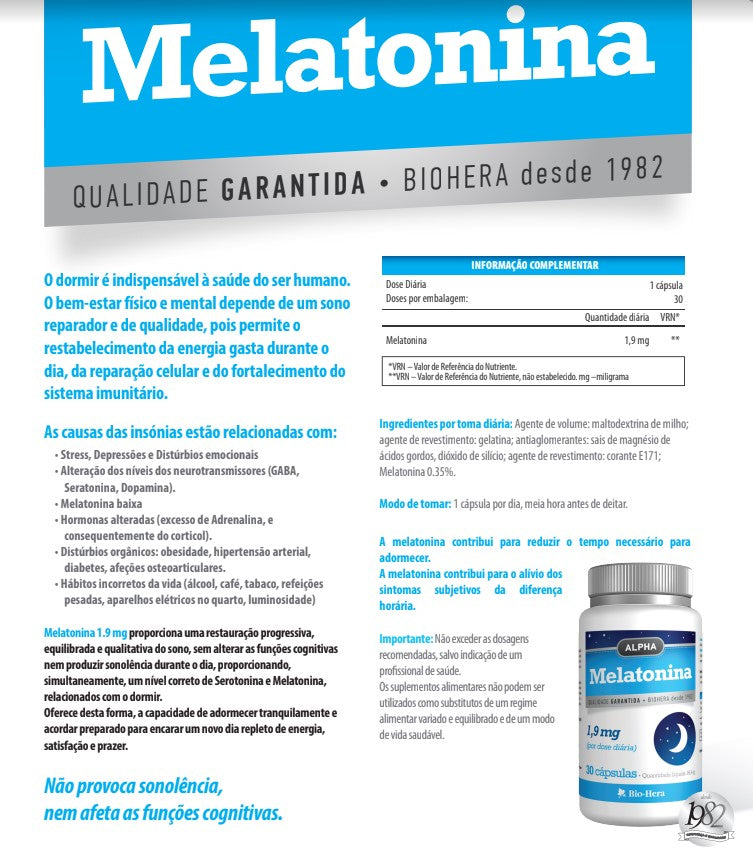Melatonina 1. 9 mg proporciona uma restauração progressiva, equilibrada e qualitativa do sono, sem alterar as funções cognitivas nem produzir sonolência durante o dia, proporcionando, simultaneamente, um nível correto de Serotonina e Melatonina, relacionados com o dormir.  Oferece desta forma, a capacidade de adormecer tranquilamente e acordar preparado para encarar um novo dia repleto de energia, satisfação e prazer.  Não provoca sonolência, nem afeta as funções cognitivas.