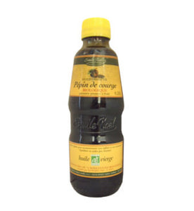 Óleo vegetal indicado para temperos. Não refinado e não desodorizado. A primeira pressão a frio em prensa mecânica seguida de uma simples filtragem através de papel absorvente salvaguarda toda a riqueza em ácidos gordos mono e poli-insaturados da pevide de abóbora. A cultura biológica sem utilização de pesticidas nem de adubos químicos, preserva o ambiente e conserva no óleo o sabor autêntico da semente. Uma selecção rigorosa são a garantia da qualidade e do sabor marcado deste óleo verde escuro com reflexos vermelhos. O aparecimento de um ligeiro depósito é normal, é um sinal de qualidade.
