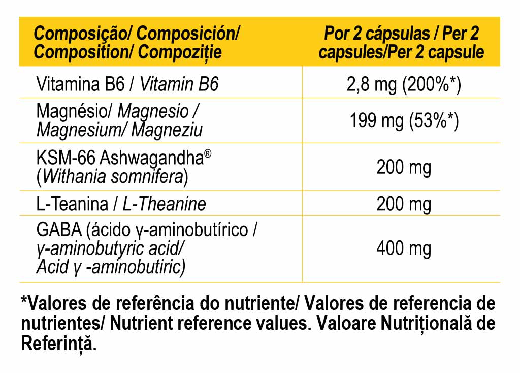 GABA (ácido γ-aminobutírico), óxido de magnésio, agente de volume (E460i), agente de revestimento (E464), KSM-66 Ashwagandha®12:1 (Withania somnifera, raiz, 5% witanolidos), L-Teanina, antiaglomerante (E470b), cloridrato de piridoxina.